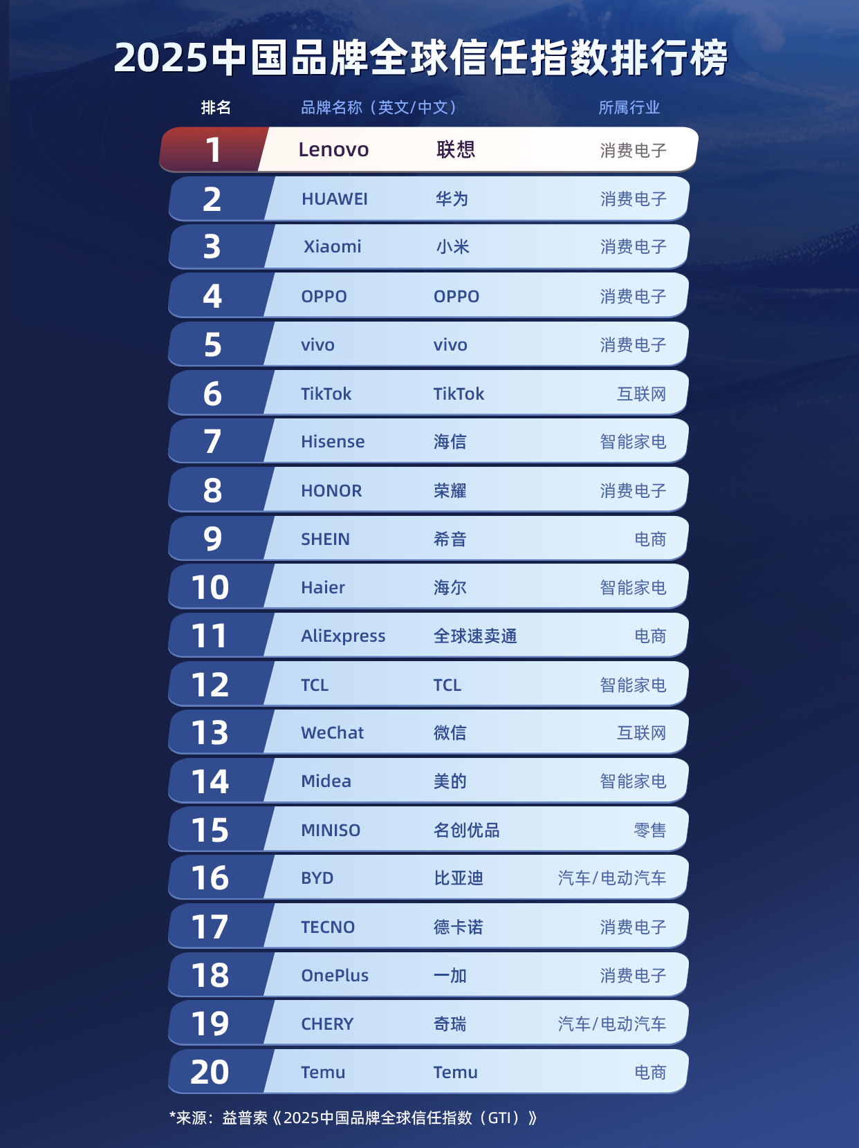在益普索(Ipsos)权威发布的“2025中国品牌全球信任指数排行榜”中,联想集团(Lenovo)再次夺下榜首,蝉联全球最受信任中国品牌